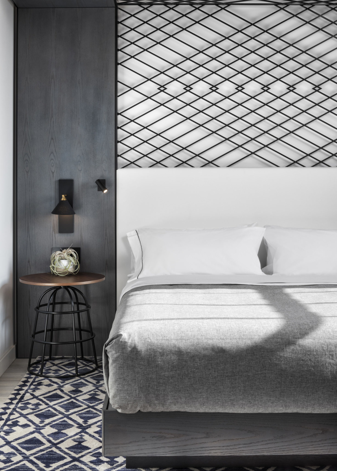 The interiors draws heavy inspiration from Scandinavian home-works. Abstractions of quilting and weaving are present throughout the hotel’s artwork and in its fixtures and furnishings. Intentional about creating a design that is rooted in the building’s history without feeling overtly industrial, the interior of the hotel exhibits delicate and subtle touch points. The interior aesthetic also celebrates the materiality of the building. The centerpiece of the building’s lobby is its atrium art installation, a sculpture designed to evoke the image of flour falling from a sifter and brought to life by architectural artists at Trellage-Ferrill Studio. In addition to the atrium sculpture, works from local artists are featured throughout the space that celebrate Minnesota’s natural landscape.