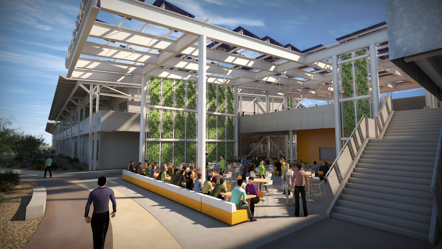 The campus is comprised of a series of interconnected buildings that include indoor and outdoor project rooms, a learning stair, student dining, and an athletic training corridor to take advantage of the mild southwestern climate. A 225 KW solar system provides shade to reduce solar radiation and assist in energy efficiency, contributing up to 20% of energy needs for the campus.