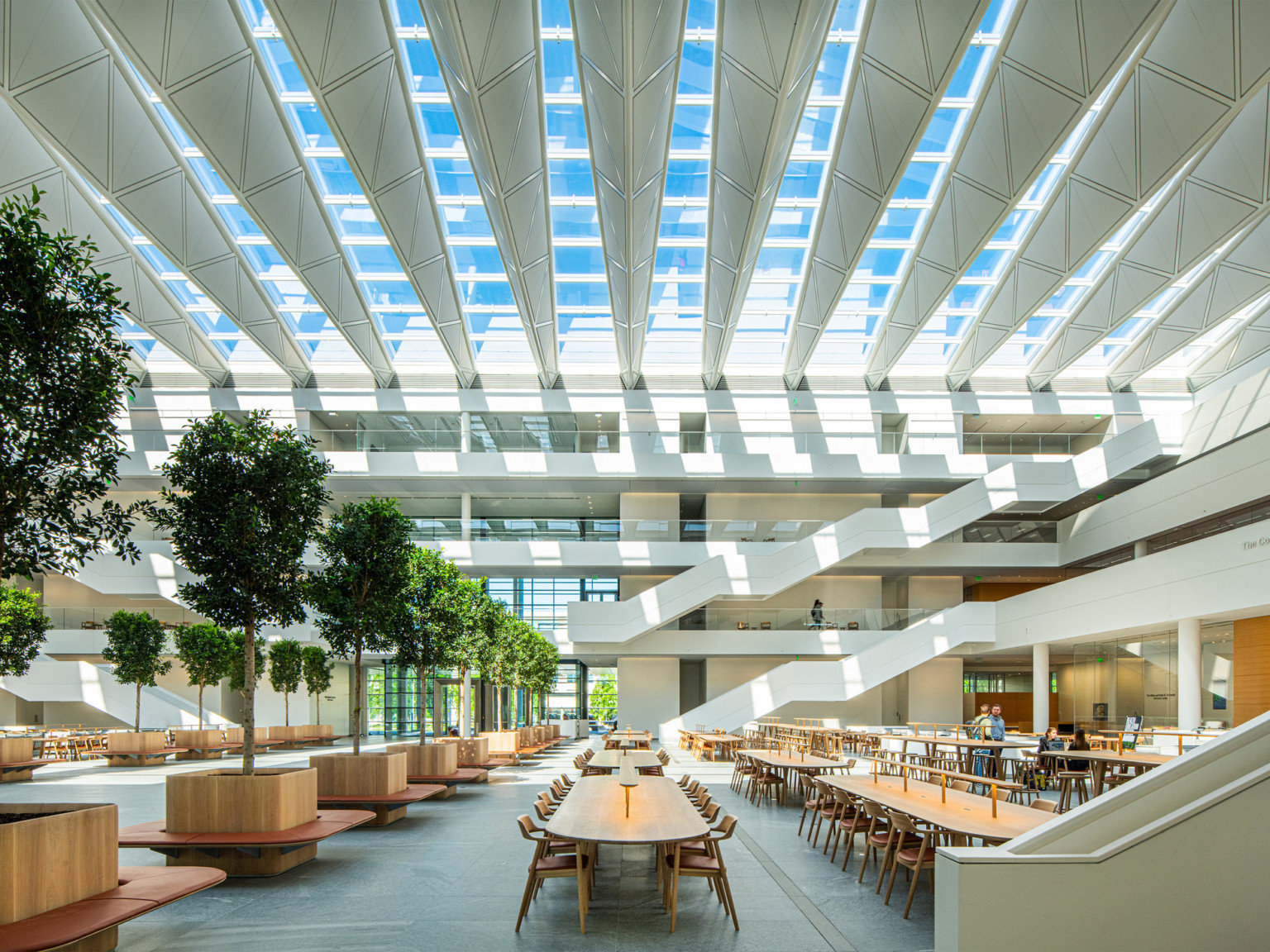 The facility features a mixture of lecture halls, classrooms, skills labs, administrative and office workstations, meeting rooms, conference rooms, and staff spaces organized around communal spaces. DLR Group partnered with Foster + Partners to provide architect of record, structural engineer of records, and interior services for this LEED Gold project.