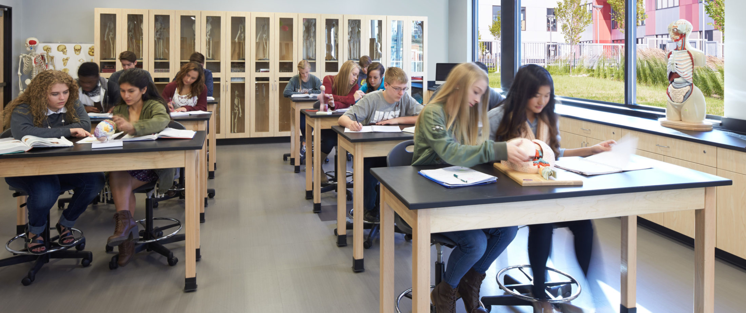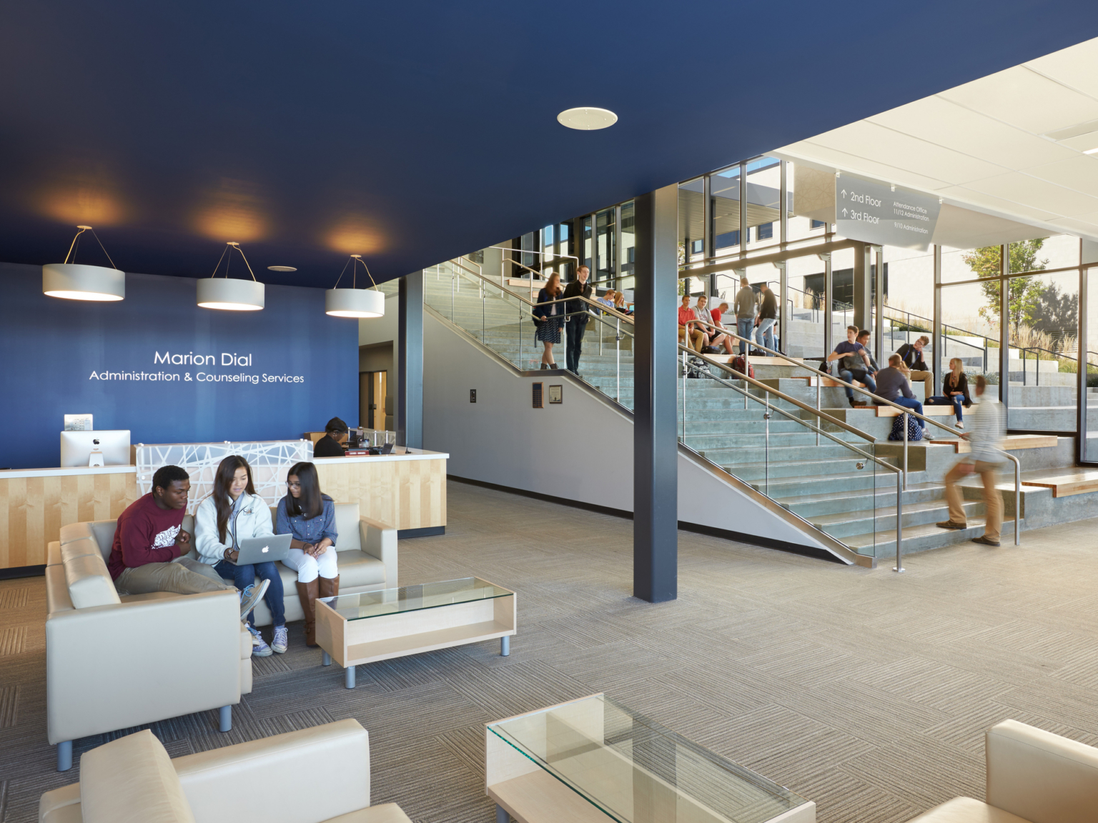 DLR Group's fast-track design transformed an abandoned big box retail space into a 21st century high school in 55 days. The design was more than a stop-gap solution. It was an inspiration to students and served as a rallying point for the healing community. The school comprised six small learning communities that divided the larger student population into 200-student studios and offered a more intimate learning environment for students and staff. Small and large group collaboration areas with a variety of seating accommodated individual or group learning, while large openings, oversized pivot doors, and a diverse array of soft and structured furniture allowed students to customize spaces to fit their personal preferences. Many of these design features are found in the new high school.