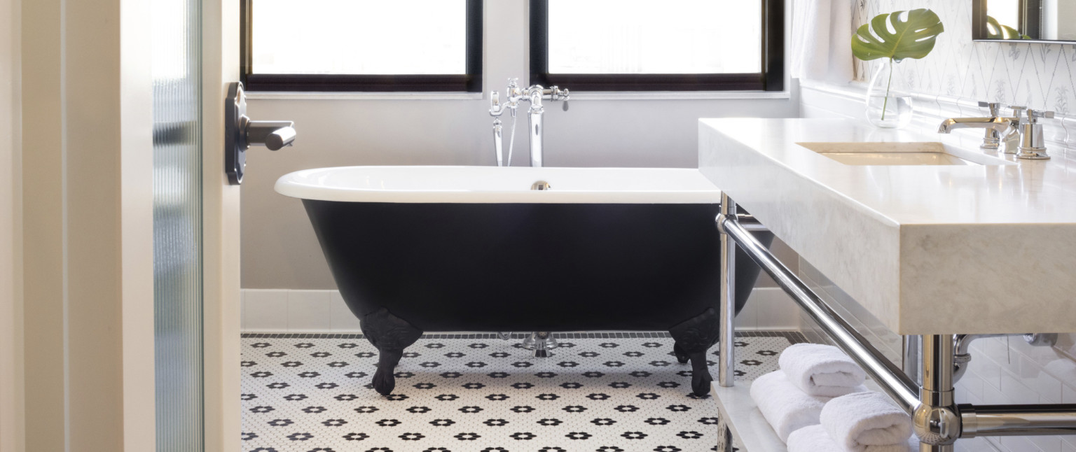 Custom wallcoverings in the guest baths are reflective of Midwestern prairie illustrations and reminiscent of the hotel’s early days, when wallpaper and cheerful patterns were aplenty.