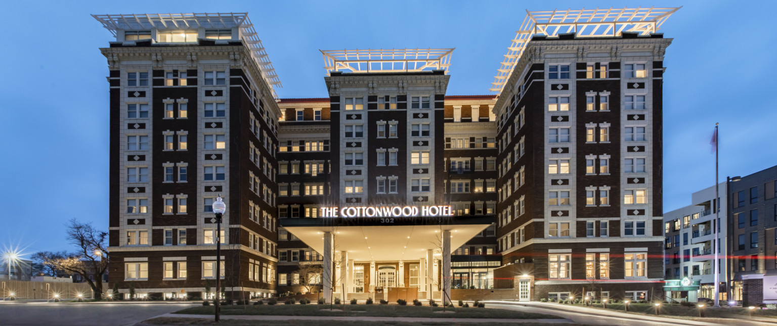 Restored, renovated, and reimagined, the Kimpton Cottonwood resonates with a reverent respect for the former Blackstone Hotel’s historic legacy in Omaha. The design goal was not recreation, but instead a celebration of the spirit and heritage of the original Blackstone Hotel. The design maintains the original tile and hardwood flooring and includes meticulously restored design details such as the marble staircase, translucent photo mural of the Missouri River, and eighth floor ballroom with sweeping views of the city. Hand-carved plaster columns, pilasters, and scrolling moldings once again adorn the social spaces, and like the original Cottonwood Room, the speakeasy cocktail bar features the original Art Deco sign and historically accurate circular feature bar highlighted by its metallic white Cottonwood tree canopy.