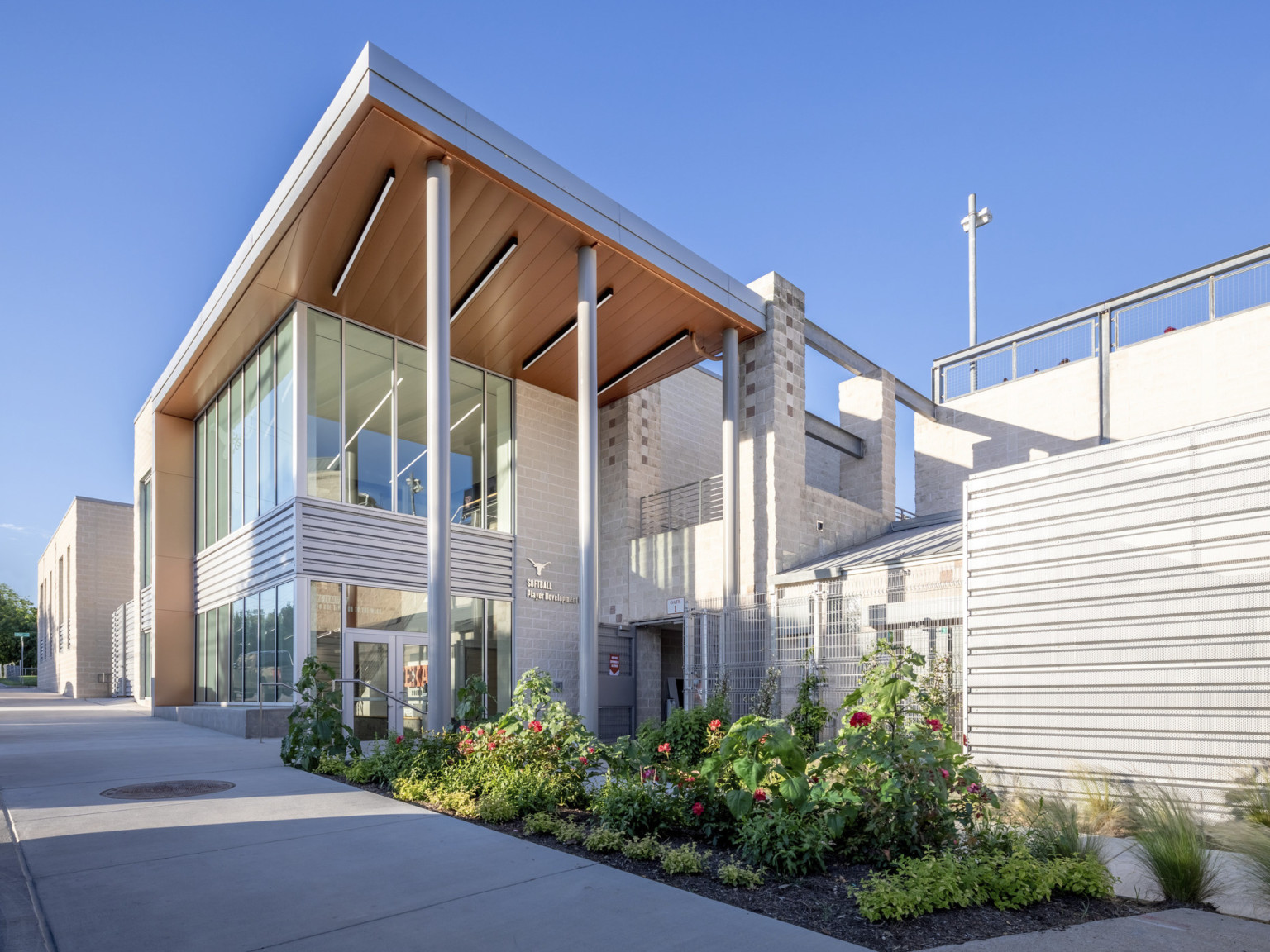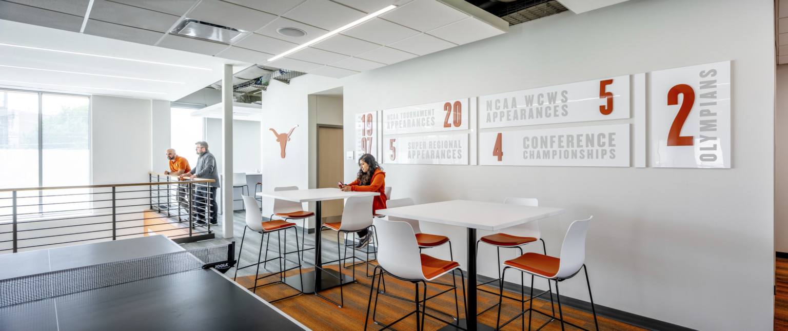 Across the street from the baseball program’s facility, we designed the Softball Development Facility at Red & Charline McCombs Field for the perennial national powerhouse Longhorn Softball program. Also focused on the performance of, and convenience for, student-athletes, the dynamic facility features an indoor hitting and pitching lab, new team locker room, player lounge, team meeting room, coaches’ offices and locker rooms, and renovated sports medicine and hydrotherapy areas.