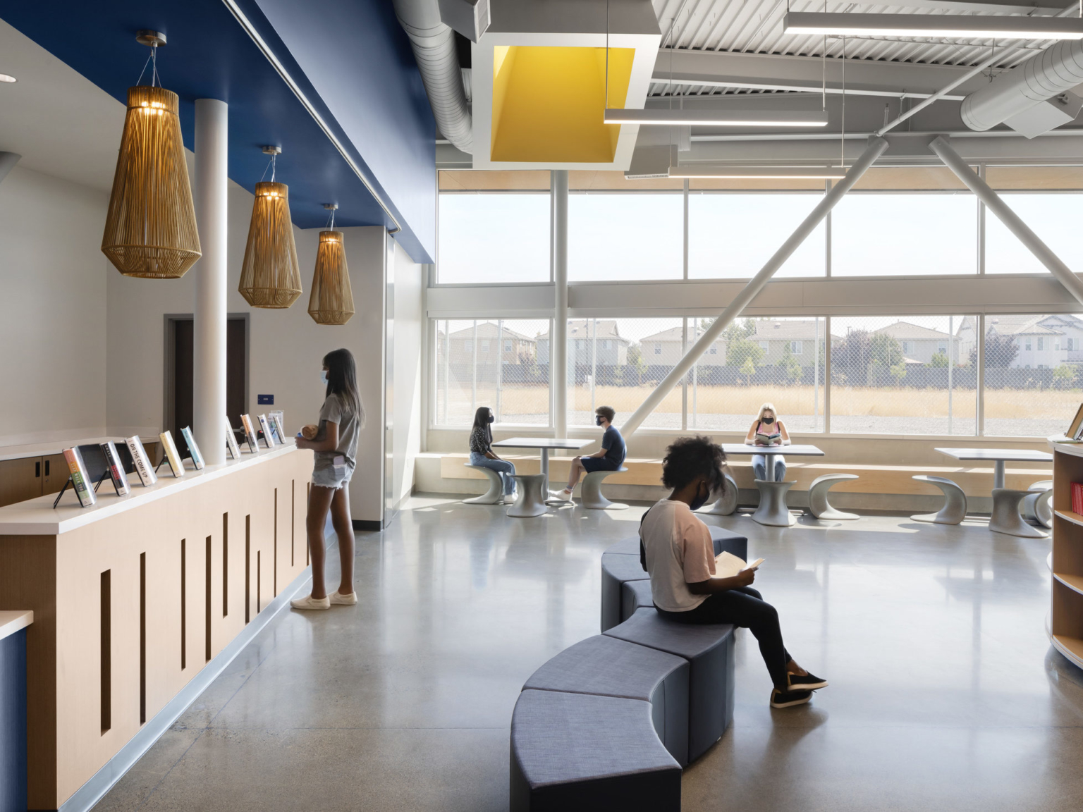 Designed to make students feel connected to the school and enhance their senses, the Learning Commons supports a variety of functions from social activities, interactive learning, studying, accessible student services, and counseling. The academic portion of the campus consists of two, three-story collaborative learning suites. The ground floor features specialty classrooms with glass walls and operable garage doors that display and extend learning spaces to the outdoors, creating additional teaching opportunities.
